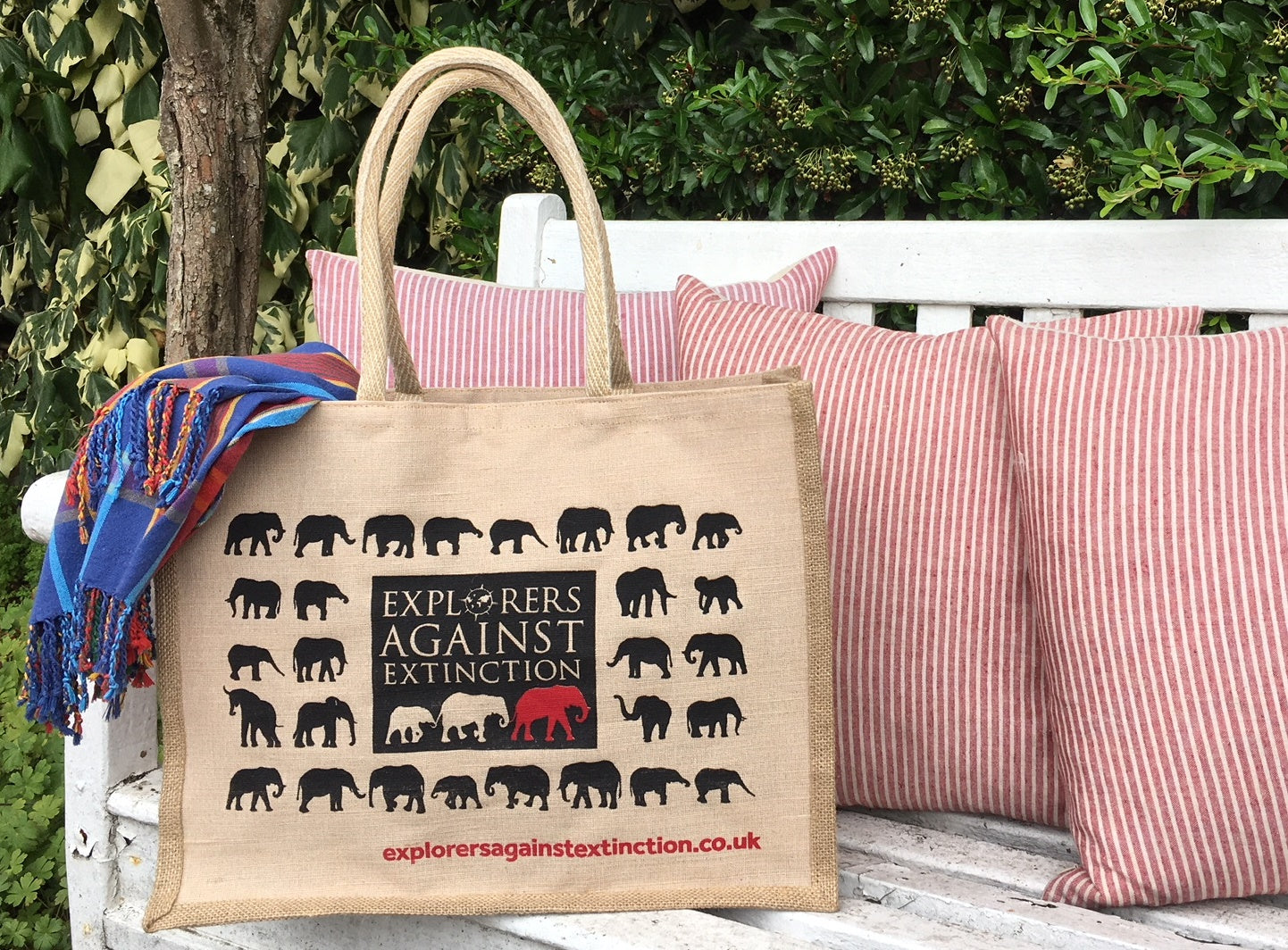 These natural biscuit jute shopping bags show the number of elephants poached in the wilds of Africa in an average day (average number based on 24 hours at a rate of one every 26 minutes).