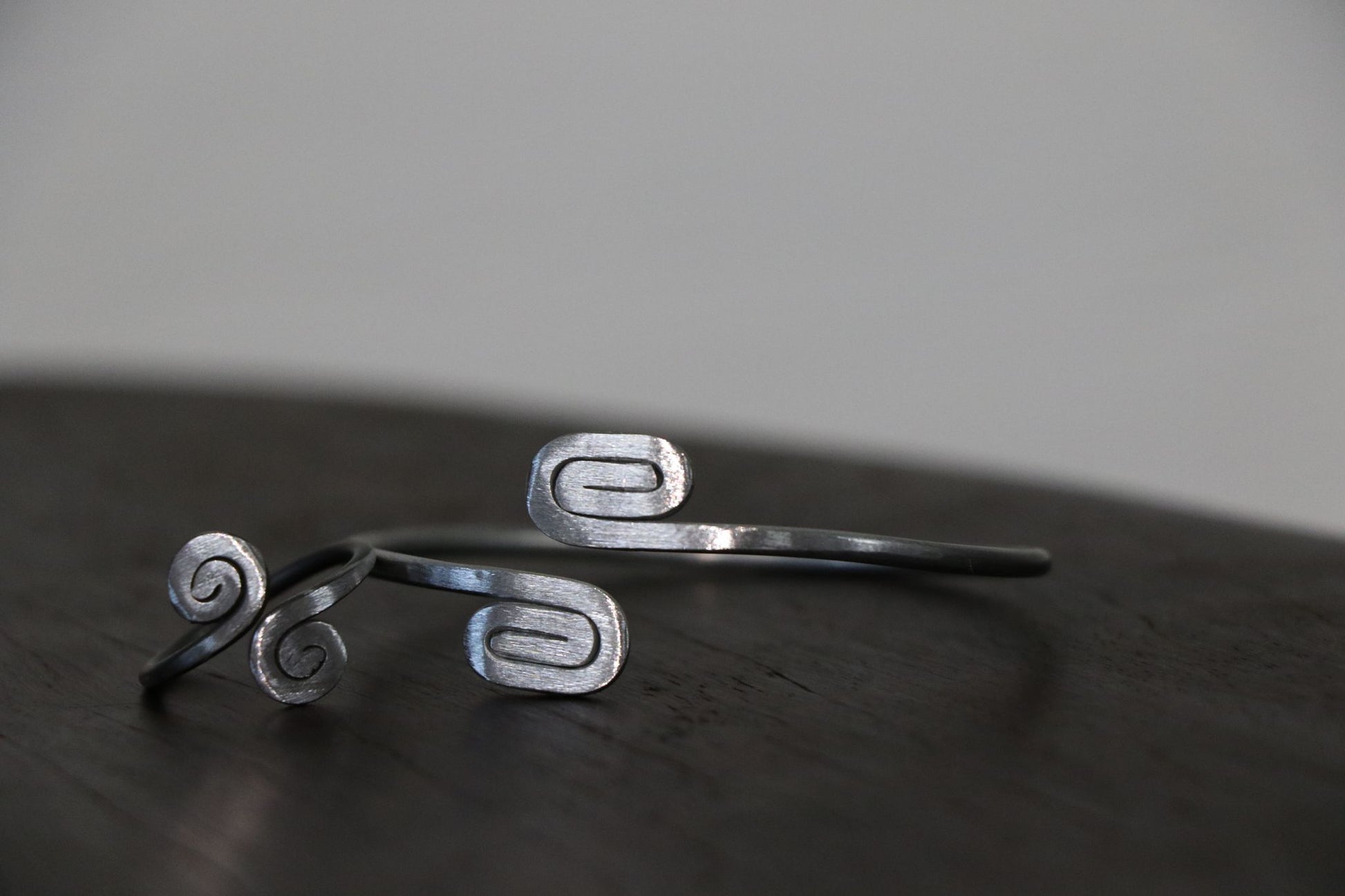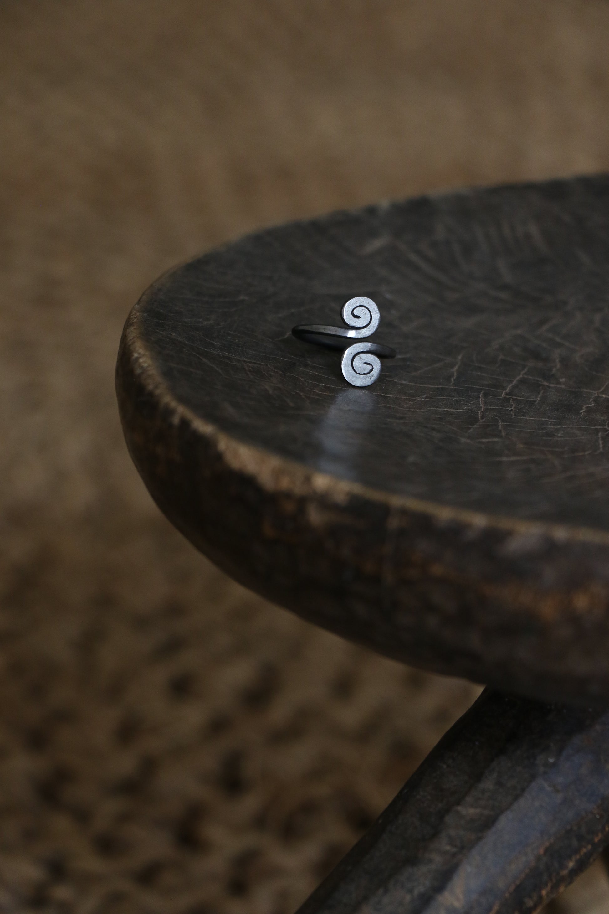 Pretty ring handcrafted in South Africa from snare wire removed from the bush. One size. Can be adjusted to fit. Matching silver-colour snare wire bangle also available.